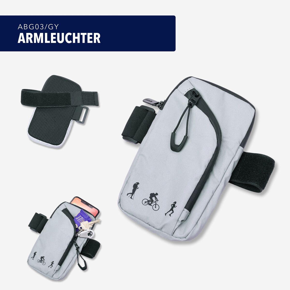 Armtasche mit 2 Reißverschlussfächern, stark reflektierend, für Sport und Freizeit, Hauptfach passend für gängige Smartphones, Frontfach für z.B. kabellose In-Ear-Kopfhörer, Schlüssel, Karten, Reißverschlüsse gummiert, spritzwassergeschützt (Wasserdichtheitsgrad IPX4), stufenlos verstellbarer Klettverschluss mit 2 Gummizügen für Elastizität, gepolsterte Rückseite, 100% Polyester, Polyester, Grau