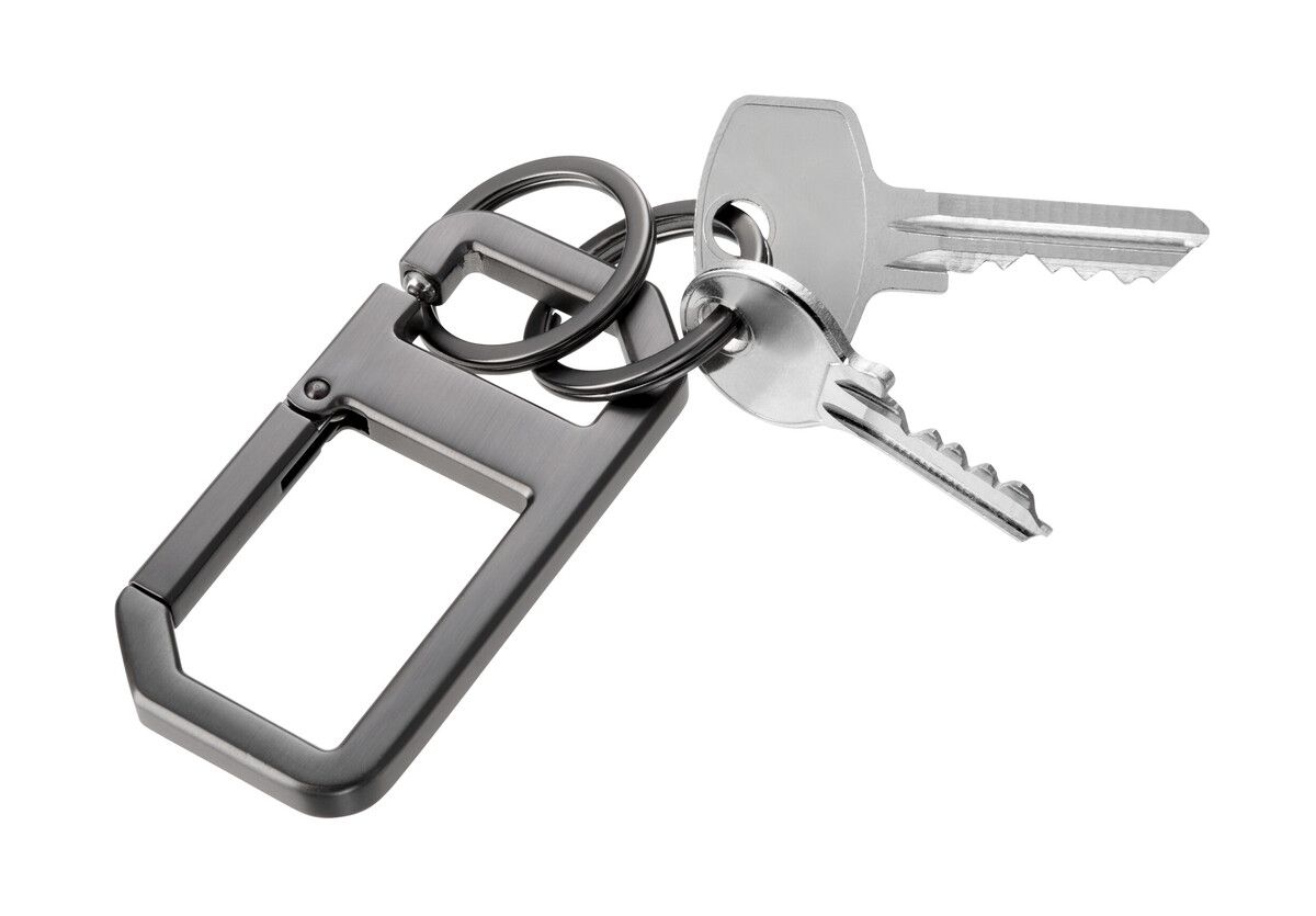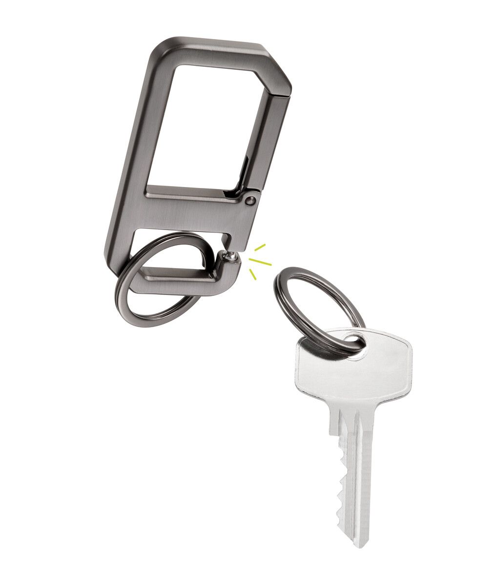 Schlüsselanhänger und Karabiner, mit praktischem "Klick-Verschluss", inklusive zwei Schlüsselringen, Metallguss, matt, Grau
