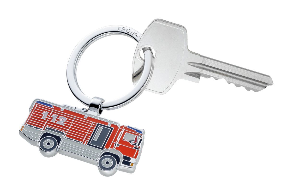 Schlüsselanhänger , Feuerwehrauto, Emaille / Metallguss, glänzend, Rot / silberfarben