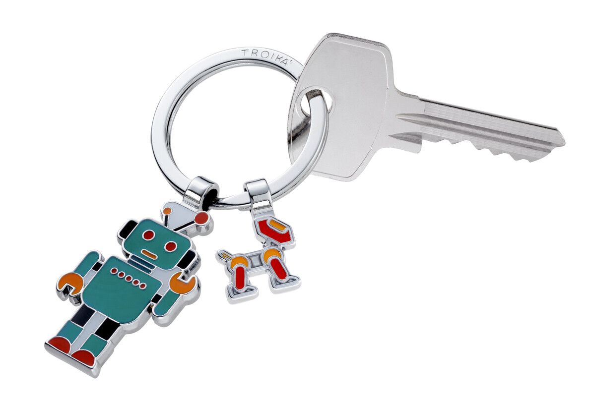 Schlüsselanhänger , Roboter mit Hund, Emaille / Metallguss, glänzend, Mehrfarbig