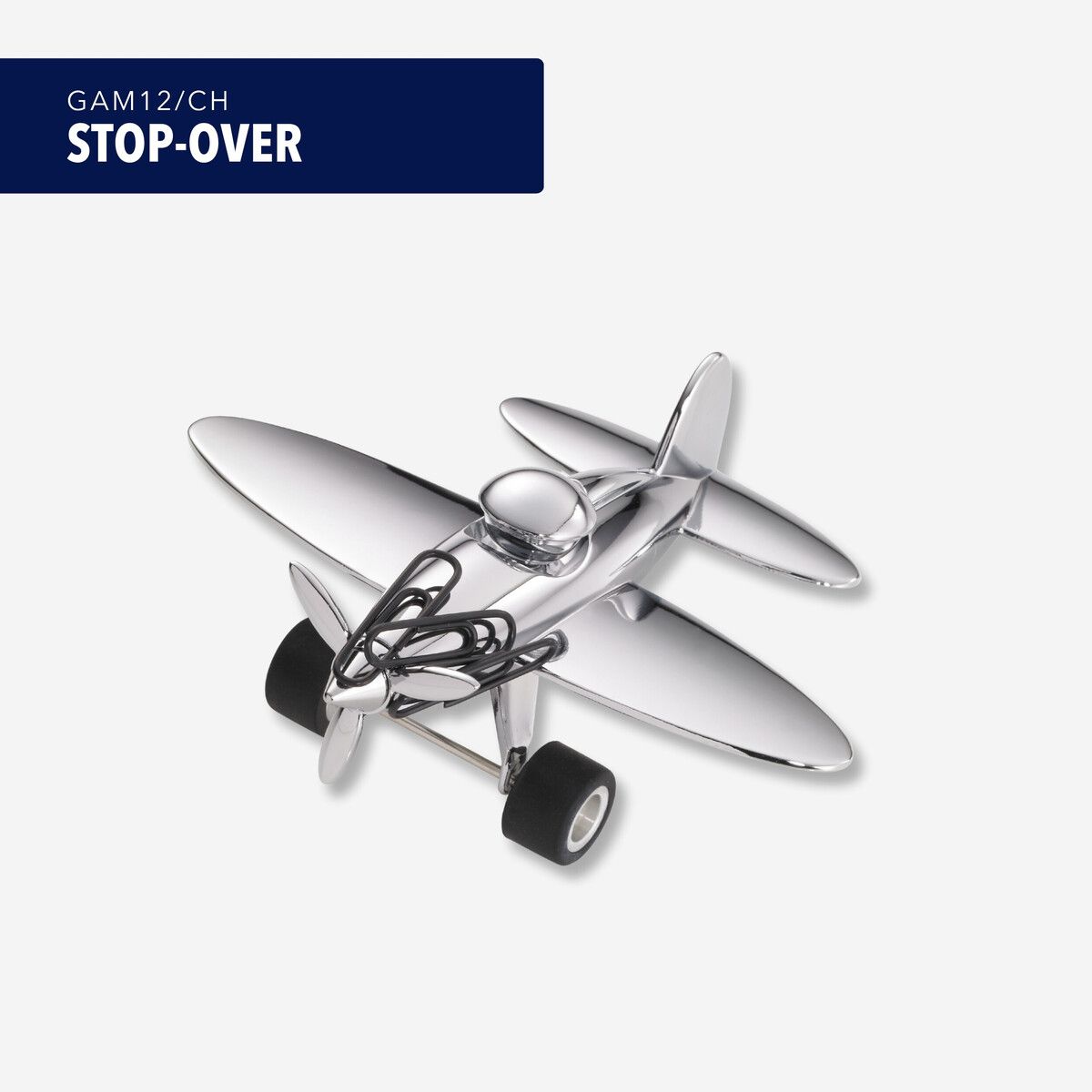 Turn your desk into a runway! Be a pilot at least once in your life. This is not just a little boy’s dream – flying is everyone’s dream. With the shiny chrome-plated aeroplane STOP-OVER this dream is within reach. Why wait: wind up the pull-back motor, release it and STOP-OVER will carry your thoughts to far horizons. After landing, the propeller magnet will hold your paper clips securely.
