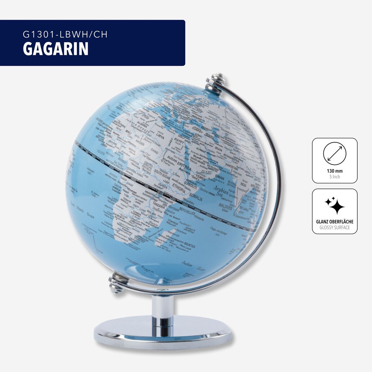 - Attractive design: Glossy two-colored globe GAGARIN (13cm diameter) with white country areas and light blue seas, labeled in English with continents, oceans, countries, geographical zones and important cities.