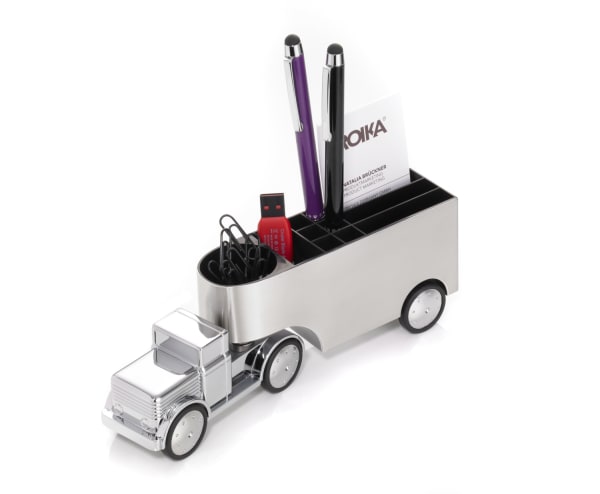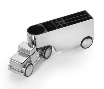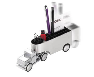 Straßen.Verkehrs.Ordnung. Volle Ladung, Vollgas. Der Chromtruck OFFICE TRUCKER bringt's! Bewegliche Achse, Magnet, Rückziehmotor. Mobilität und Schnelligkeit bekommen mit dem Chromtruck OFFICE TRUCKER einen festen Platz auf dem Schreibtisch. Der glänzende LKW mit beweglicher Achse und Rückziehmotor liefert pünktlich aus: Visitenkarten, Stifte, Klammern und andere Kleinigkeiten. Ein echtes Kraftpaket.