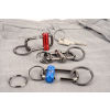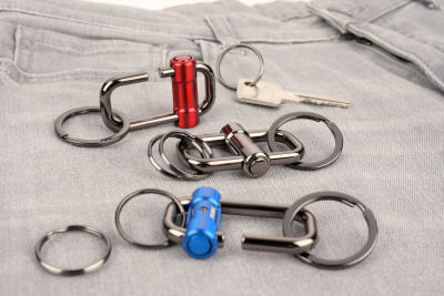 Coole Technik für alle, die öfter mal die Schlüssel wechseln. Einfach per Knopfdruck die Verriegelung lösen, und der Metallbolzen gleitet geschmeidig nach links oder rechts und gibt die Schlüsselringe frei. Aus massivem Metallguss in Gunmetalgrau mit silbernem, schwarzem, grauem, blauem oder rotem Verschluss.