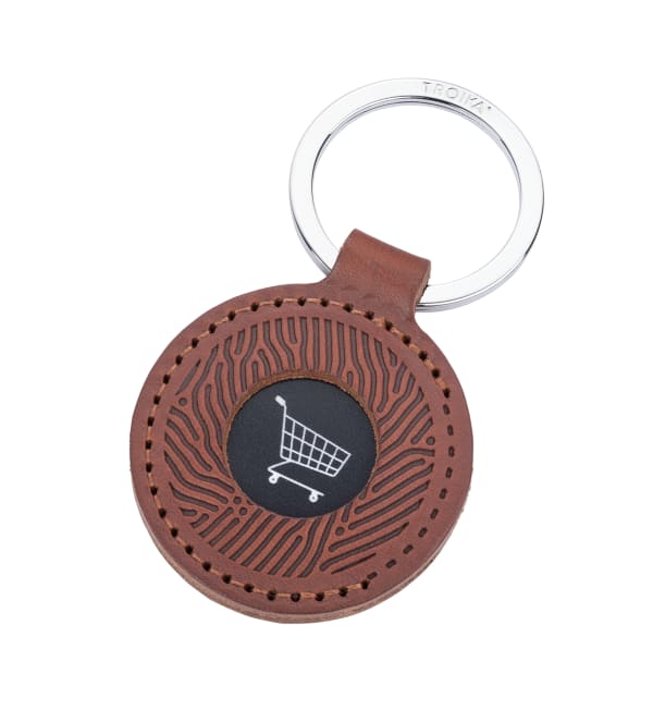 Schlüsselanhänger aus hochwertigem italienischen Echtleder mit Einkaufswagenchip aus Metall, seitliche Öffnung zur Entnahme des Chips, auch für 1€-Münzen geeignet, Prägung: Vorderseite Musterprägung, Rückseite: COIN ADVENTURE, Handarbeit, MADE IN ITALY, Leder, Metall, braun