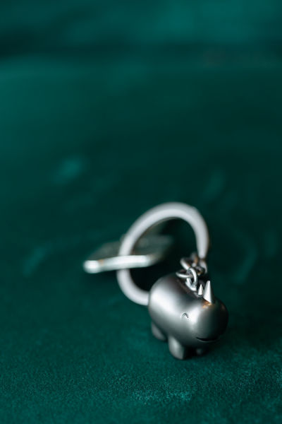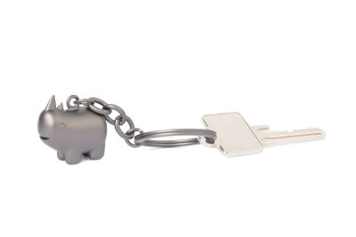 Schlüsselanhänger, rundliches, gut gelauntes Nashorn, Metallguss, verchromt, matt, gunmetal