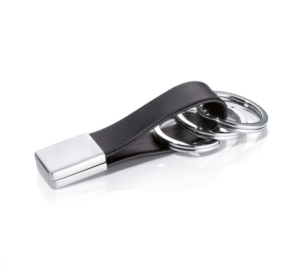 Schlüsselanhänger mit eckigem "Twist-Verschluss", Lederschlaufe, 3 Schlüsselringe, Leder, Metallguss, verchromt, matt, schwarz