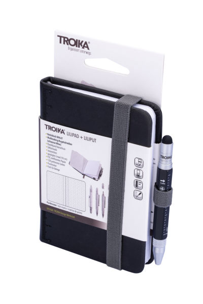 Unser kleinster Multitasking-Kugelschreiber LILIPUT hat jetzt einen starken Partner: LILIPAD, das große kleine Notizbuch im Format DIN A7. Mit geprägtem 10-cm-Lineal und Elastikband-Verschluss, Block mit perforierten Seiten und praktischem Punktraster. Zusätzliches Fach für Belege oder Karten. LILIPAD + LILIPUT TOOL PEN by TROIKA – so klein und doch so ein bärenstarkes Team.