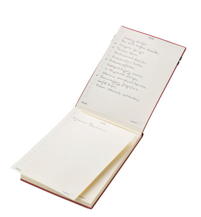 Notizblock DIN A5, Prägung "TO DO" auf Cover, elastische Kordel als Verschluss, FSC zertifiziertes Papier, gedrucktes Lineal (20 cm) auf Deckblatt, 88 perforierte Blätter (176 Seiten), Fach für Belege, hochkant (oben gebunden), Kästchen zum Abhaken + Punktraster, Kunstleder, matt, rot