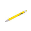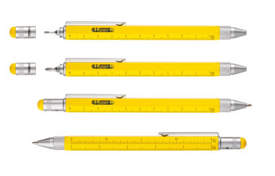 Multitasking-Kugelschreiber, Zentimeter/Zoll-Lineal, 1:20 /1:50 Skala, Wasserwaage, Schlitz-/Kreuzschraubendreher, Stylus, schwarze Mine, Messing, lackiert, gelb/silberfarben