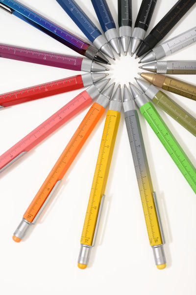 - Kugelschreiber, Planungshilfe und Werkzeugkoffer in einem. Mit Zentimeter- und Zoll-Lineal, 1:20 m und 1:50 m Skala, Wasserwaage, Schlitz- und Kreuzschraubendreher und Stylus.