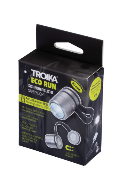 Wer öfter zum Sport in der Dämmerung oder der Dunkelheit draußen ist, weiß, wie schnell man übersehen wird. ECO RUN heißt Safety first – gerade in der dunklen Jahreszeit. Einfach das Sport- und Sicherheitslicht an den Kragen oder an die Kleidung clippen – mit der Silikonschlaufe und dem starken Magnet geht das ganz easy. Jetzt nachhaltig ins rechte Licht setzen: mit zwei Lichtstärken, Blinklicht und Wiederaufladen per USB.