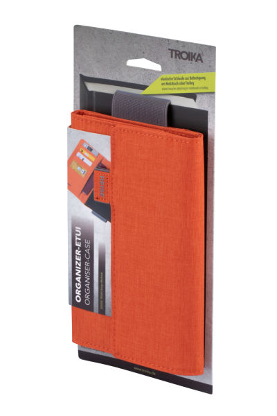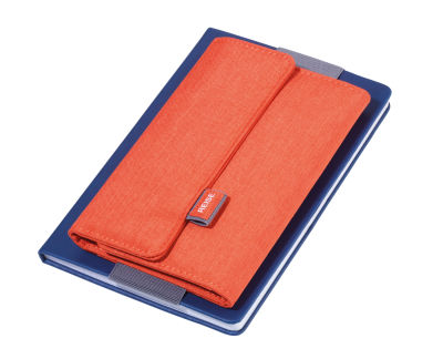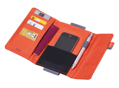 REISEBÜRO schafft richtig Ordnung. Fünf Innenfächer nehmen wichtige Reisedokumente und Kredit- oder Visitenkarten auf. Und das Smartphone? Das klemmt sich ganz entspannt in ein Elastikbandfach. Für Immer-und-Überall-Schreiber gibt es zwei Stiftschlaufen, eine innen und eine außen. Richtig clever: Mit der breiten elastischen Schlaufe lässt sich das Organizer-Etui einfach am Trolley befestigen. Oder am Cover eines DIN A5 Notizbuches. Aus angenehm weichem Polyester in Grau/Schwarz, Blau/Grau und Grau/Orange.