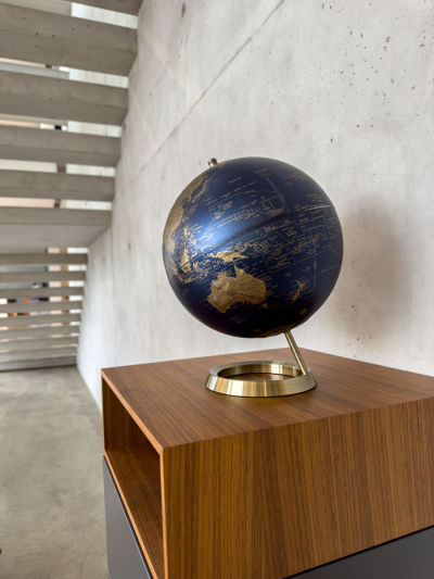 - Matter, zweifarbiger Globus (25 cm Durchmesser) mit einer Neigung von 23,5 Grad, goldenen Länderflächen und blauen Meeren, beschriftet in englischer Sprache. Enthält Ozeane, Länder, geographische Zonen und wichtige Städte. Die Gebirge sind auf der Oberfläche fühlbar hervorgehoben.