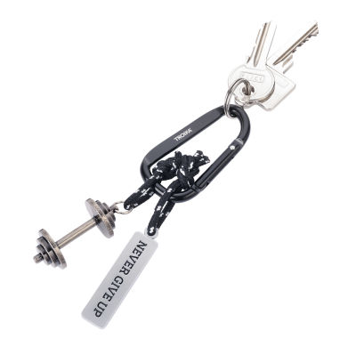 Gib niemals auf! Mit dieser Botschaft am Schlüsselring zusätzlich zum Hantel-Charm hat man den täglichen Reminder: Ich kann es schaffen, ich kann die Ziele erreichen, die ich mir gesetzt habe, sei es in punkto Fitness, Gesundheit oder in anderen Lebensbereichen. Gefertigt aus einer Zinklegierung, hat der Hantelanhänger eine Patina, die vermittelt: ich bin in Gebrauch. Mit dekorativen Schnüren sind die beiden Anhänger befestigt an einem praktischen Karabiner.