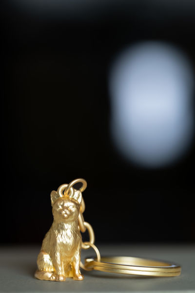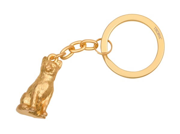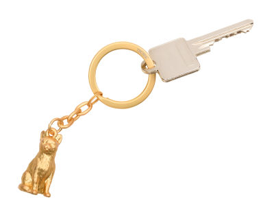 Schlüsselanhänger in Form einer Katze, Metallguss, verchromt, matt, goldfarben