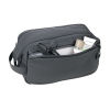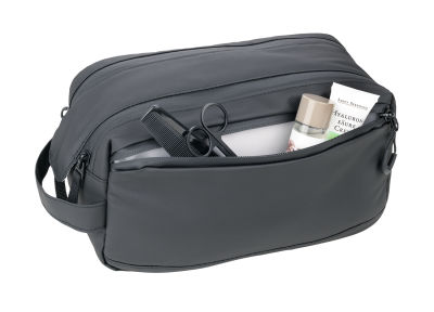 Kulturbeutel, Hauptfach mit weiter Öffnung zur einfachen Entnahme, zwei Reißverschlüsse und zusätzlicher Magnet zum Verschließen, zwei Meshfächer und drei Elastikbänder im Hauptfach, zusätzliche Fronttasche, mit Handschlaufe, wasserabweisende Reißverschlüsse, spritzwassergeschützt (Wasserdichtheitsgrad IPX4), Tarpaulin: 80% Polyester, 20% Polyurethan (PU), Tarpaulin (Plane), schwarz