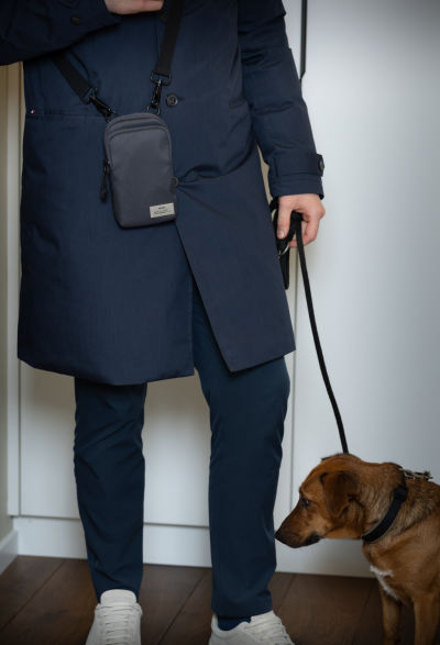 Smartphone Umhängetasche aus recyceltem Meeresplastik, großes Fach für das Smartphone, weiteres Fach für andere Utensilien (Visitenkarten, Schlüssel, Bargeld, Kopfhörer, etc.), verstellbarer Gurt mit Metallkarabinern, 100% rPET, recyceltes Meeresplastik, dunkelgrau