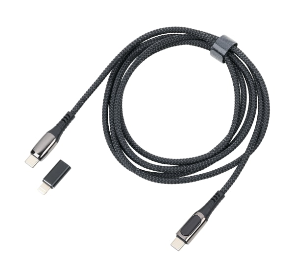 - Das stylische Kabel in gunmetal/schwarz bietet eine digitale Anzeige der Ladeleistung und kommt mit einem USB-C auf Lightning Adapter für vielseitigen Einsatz.