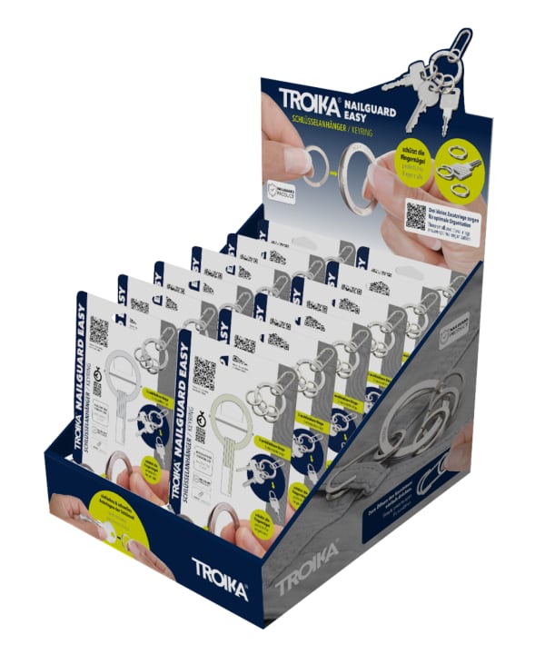 Thekendisplay inkl. 12 x NAIL GUARD EASY Schlüsselanhänger (KR25-10/..), vorsortiert (je 6 x KR25-10/ST, KR25-10/CH), zur Selbstbedienung, Pappe, bedruckt, matt, mehrfarbig