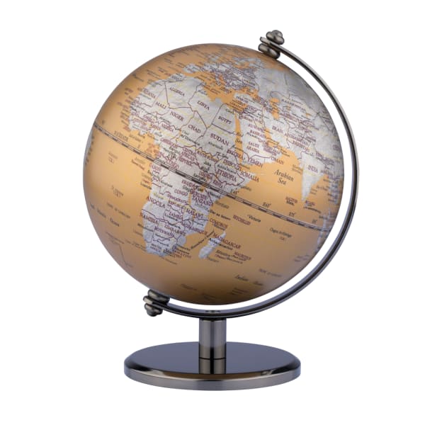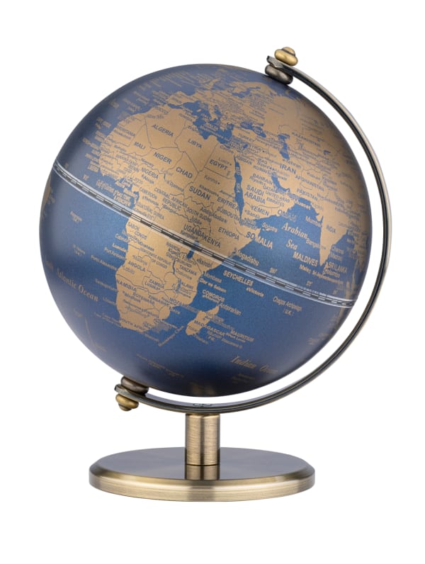 - Attraktives Design: Matter zweifarbiger Globus GAGARIN (13cm Durchmesser) mit goldenen Landflächen und dunkelblauen Meere, in englischer Sprache beschriftet, mit Kontinenten, Ozeanen, Ländern, geographischen Zonen und wichtigen Städten.