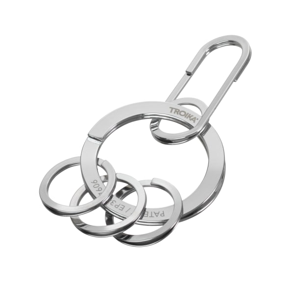 Der TROIKA-Schlüsselanhänger mit Karabiner überzeugt mit smarter Funktionalität. Der patentierte NAIL GUARD-Mechanismus ermöglicht ein schnelles und unkompliziertes Anbringen von Schlüsseln – ganz ohne Kraftaufwand und ohne beschädigte Fingernägel. Drei kleine Zusatzringe sorgen für optimale Organisation. Gefertigt aus glänzendem Edelstahl in Silber, verbindet er langlebige Qualität mit modernem Design.