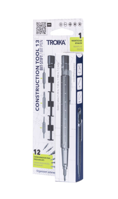 CONSTRUCTION TOOL 13 vereint 12 Präzisions-Bits in einem schlanken Tool-Pen – darunter auch spezielle Bits für Apple® Geräte. Die magnetische Spitze hält den Bit beim Arbeiten sicher in Position. Mit dem Stiftende können die Bits magnetisiert werden, damit kleine Schrauben leichter haften und nicht verloren gehen. Alle Bits sind ordentlich im Inneren des Aluminiumgehäuses verstaut. Mit integriertem Clip, Lineal in Zentimeter/Zoll und 1:20/1:50 Skala – ideal für feine Technikarbeiten und schnelle Reparaturen. Technisch durchdacht, präzise und einfach praktisch.
