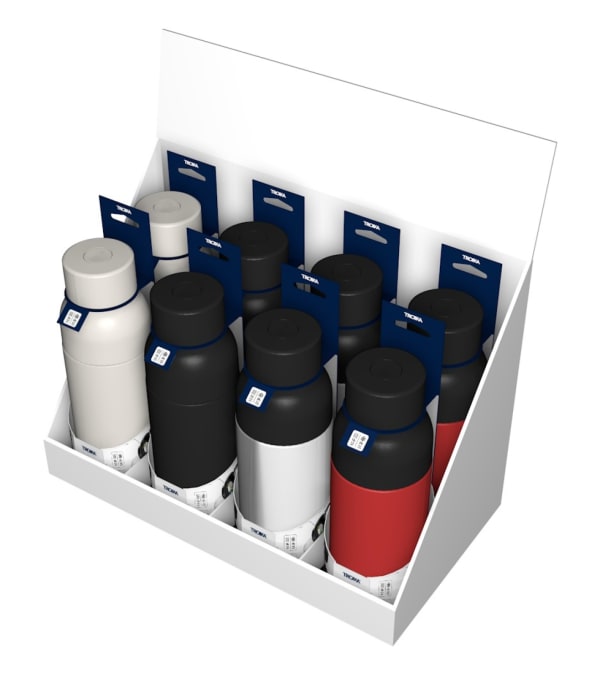 Thekendisplay inkl. 8 x INFUSE+ Thermoflasche (VAC26/..), vorsortiert (je 2 x VAC26/BK, VAC26/RD, VAC26/ST, VAC26/WH), zur Selbstbedienung, Pappe, bedruckt, matt, mehrfarbig