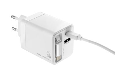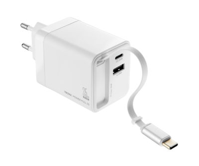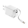 Ladestecker mit GaN- und Schnellladetechnologie Power Delivery, 35W mit USB-C und USB-A Anschluss sowie ausziehbarem USB-C Kabel (Länge 70cm), zum gleichzeitigen Laden von mehreren Geräten, Kunststoff, weiß