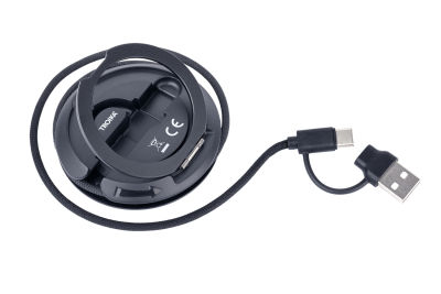 • Integriertes, aufrollbares USB-C/USB-A Kabel (60 cm) – immer dabei, perfekt verstaut, nie verknotet.