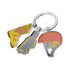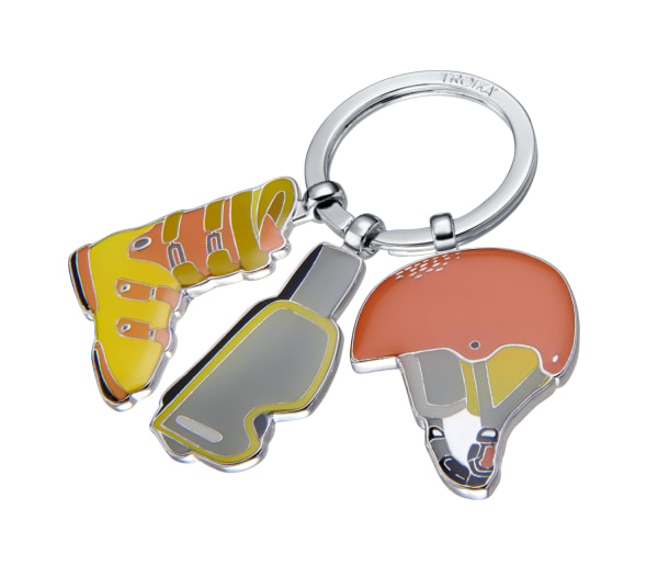 Schlüsselanhänger mit 3 Anhängern, Skibrille, Helm, Schuh, Emaille, Metallguss, verchromt, glänzend, gelb/orange