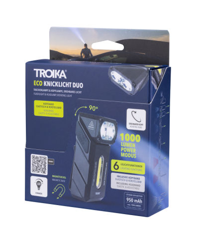 Das ECO KNICKLICHT DUO vereint Stirnlampe, Arbeitslicht und Taschenlampe in einem – mit drehbarem Kopf, zwei starken Leuchten und flexiblem Einsatz. Wiederaufladbar über USB-C-Anschluss. Dank Doppelmagnethalterung, Doppelclip und Stirnband leuchtet es genau dort, wo du es brauchst – ob am Kopf, an der Kappe, am Gürtel, am Rucksackgurt oder in der Werkstatt. Mit bis zu 1000 Lumen, sieben Lichtmodi (inkl. Rotlicht) und Dimmfunktion ist es dein Lichtprofi für Job, Outdoor und Alltag. Besonders kompakt, robust, hell – und immer dabei.