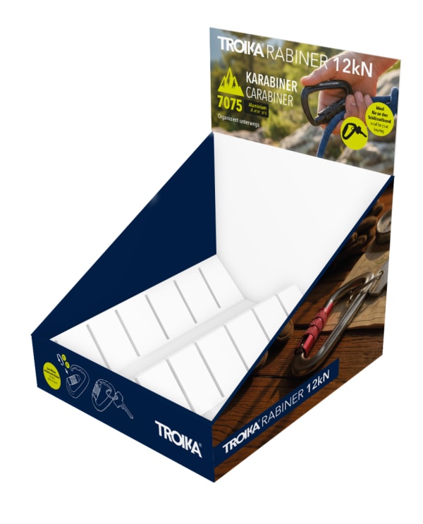 Thekendisplay für 12 x TROIKARABINER Karabiner (KAR12/..), zur Selbstbedienung, Pappe, bedruckt, matt, mehrfarbig
