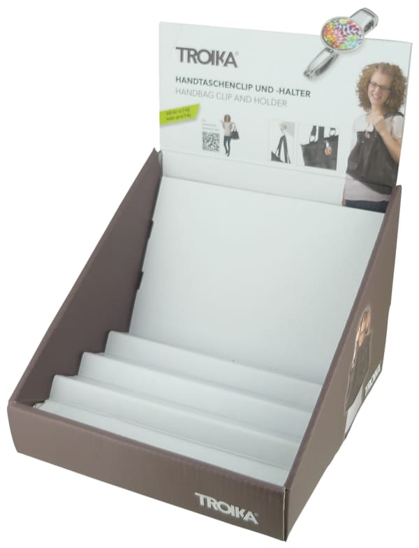 Thekendisplay für 12 x Handtaschenclip und -halter, zur Selbstbedienung, Pappe, bedruckt, matt, mehrfarbig