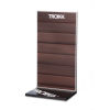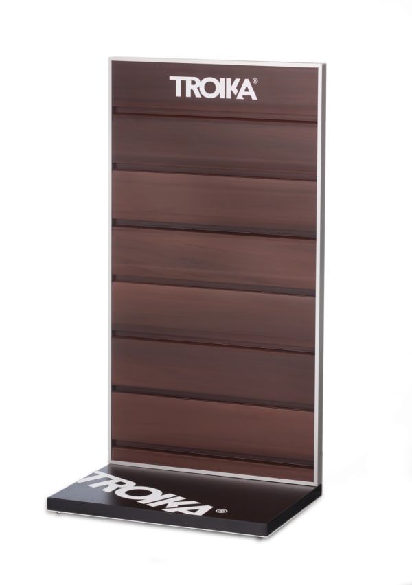 Thekendisplay zur Selbstbedienung, einseitige Lamellenwand, Holzoptik, für Eurohaken (10F306, 10F307, 10F312, 10F325), Standfuß (rechteckig), mit TROIKA-Logo, matt, braun/schwarz/silberfarben