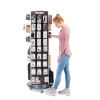 Bodendisplay zur Selbstbedienung, dreiseitige Lamellenwand, Holzoptik, für Eurohaken (10F306, 10F307, 10F312, 10F321, 10F325), für Regalboden (10F337), für Schütten (10F326, 10F335), Standfuß (rund), mit TROIKA-Logo, Drehbar, rollbar inkl. Bremsen, matt, braun/silberfarben