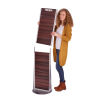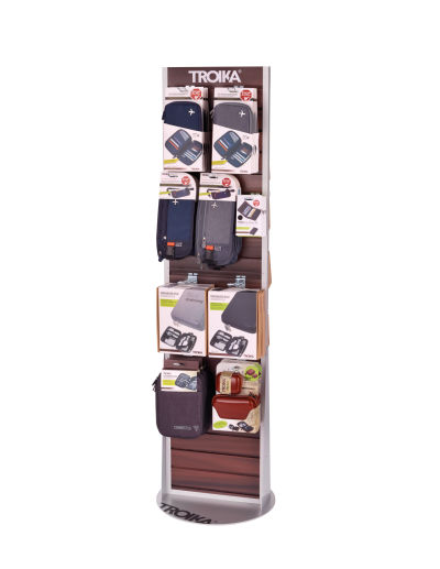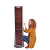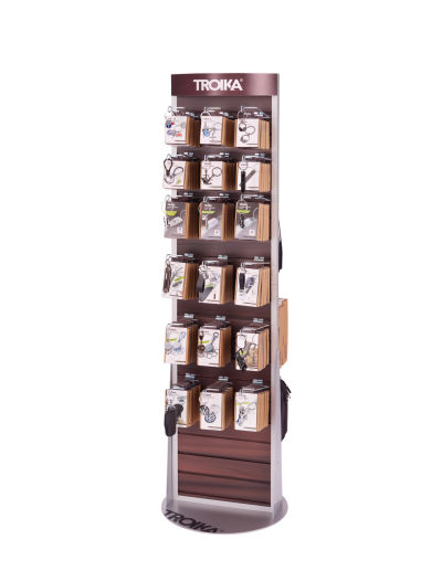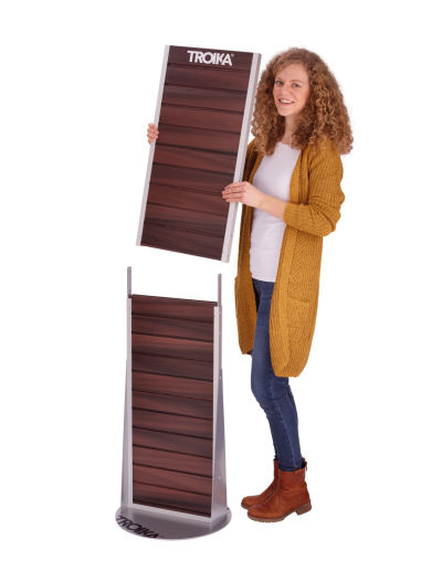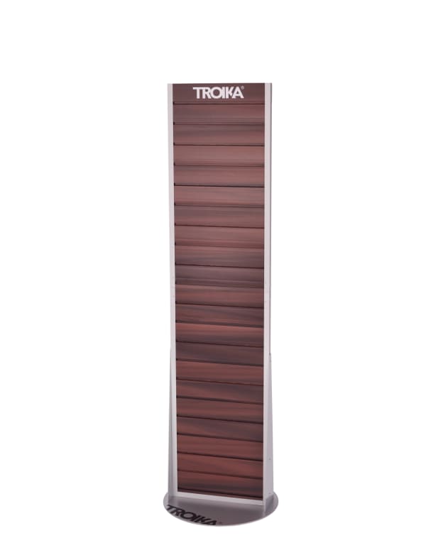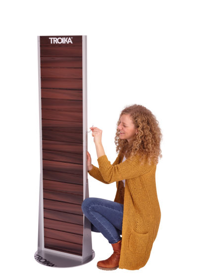 Bodendisplay zur Selbstbedienung, zweiseitige Lamellenwand, Holzoptik, für Eurohaken (10F306, 10F307, 10F308, 10F312, 10F321, 10F322, 10F325), für Regalboden (10F337), für Schütte (10F326, 10F335), Standfuß (rund), drehbar, mit TROIKA-Logo, teilbar, matt, braun/silberfarben