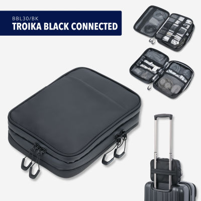 Mit TROIKA BLACK CONNECTED stecken Sie Ihr digitales Leben locker in die Tasche. Handy, Maus, Earphones, Powerbank, Netzteil, Kabel, Adapter – in den zahlreichen sinnvoll aufgeteilten Fächern ist jede Menge Stauraum. Jetzt in Schwarz und ganz aus Tarpaulin. Dieses Planen-Material ist besonders robust und abwaschbar. Clevere Elastikbänder und Netze halten das Zubehör sicher am Platz. Extrapraktisch: die Schlaufe zum Befestigen der Organizer-Tasche am Trolley. TROIKA BLACK CONNECTED – denn Organisation ist das halbe Leben. Auch wenn es analog ist.