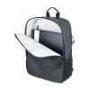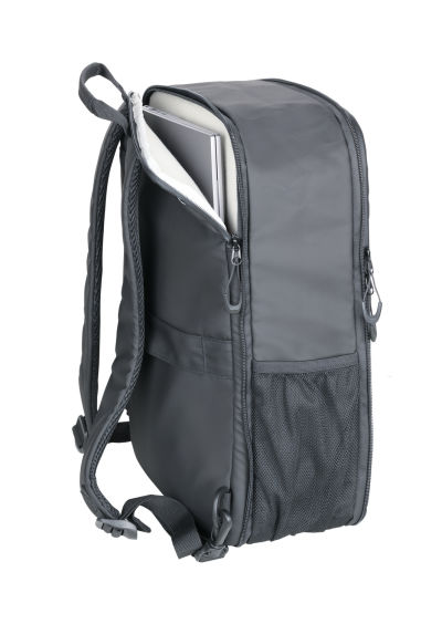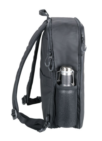 Laptop-Rucksack mit 2 großen Fächern (gepolstertes Laptopfach bis 16'' und Hauptfach) mit 2-Wege Reißverschluss, erweiterbar durch zusätzlichen Reißverschluss, 1 Fronttasche mit versteckbarem Reißverschluss-Schieber als Mini-Karabiner (Diebstahlschutz) + zusätzliches Frontfach, expandiert 2 Netztaschen für Flasche und Schirm, verstärkter Standboden, Schlaufe zur Befestigung am Trolley, Tragegriff, versteckte Rucksackgurte, wasserabweisende Reißverschlüsse außen, widerstandsfähiges Material, spritzwassergeschützt (Wasserdichtheitsgrad IPX4), Kapazität von ca. 6 Liter auf ca. 14 Liter erweiterbar, Tarpaulin: 80% Polyester, 20% Polyurethan (PU), Polyester, Polyurethan, Tarpaulin (Plane), schwarz