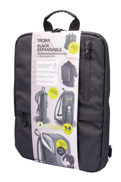 Bereit zu expandieren? Der schwarze City-Rucksack macht sich genau so groß, wie du ihn gerade brauchst. Mit 6 Litern Kapazität perfekt fürs Laptop (bis zu 16'') und den Tag im Office. Mit 14 Litern ideal fürs Shoppen danach – dank zusätzlichem Reißverschluss lässt sich TROIKA BLACK EXPANDABLE blitzschnell erweitern. Praktisch: die Schlaufe zum Fixieren am Trolley, die clevere Aufteilung mit Fächern für Laptop, Flasche und Schirm, und auch der Diebstahlschutz am vorderen Reißverschlussfach. Strapazierfähig: aus besonders robustem Tarpaulin-Material („LKW-Plane“) mit verstärktem Boden und spritzwassergeschützt (IPX4). Wie schön, dass dein neuer Begleiter auch noch richtig gut aussieht!