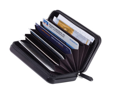 Kreditkartenetui im Stil eines Hartschalenkoffers, Reißverschluss, mit Ausleseschutz (für RFID Chips), 9 Fächer mit Platz für ca. 20 Karten, Geld und Belege, Aluminium, Polyester, matt, schwarz