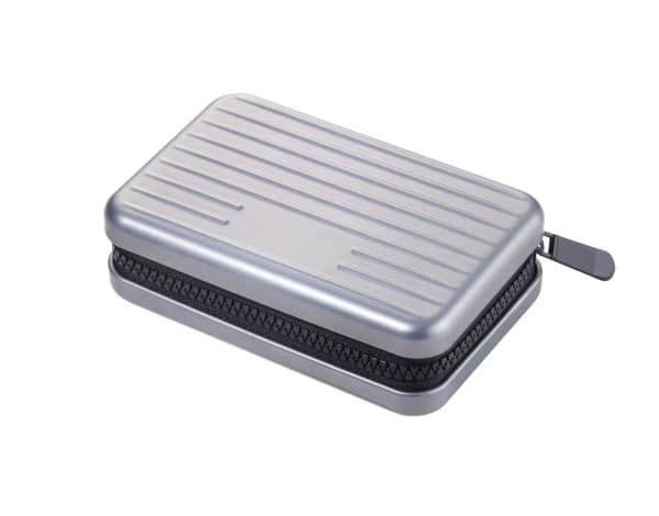 Nur 70 x 105 x 30 mm groß, aber im Design schon ganz erwachsen. Und mit Funktionen, die kaum ein großer Hartschalenkoffer vorzuweisen hat: neun Fächer mit Platz für bis zu 20 Karten, Kleingeld oder Belege, Ausleseschutz für RFID-Chips und dazu ein umlaufender Reißverschluss. Aus Aluminium und Polyester in mattem Schwarz, Blau und Rot sowie Titanfarben.