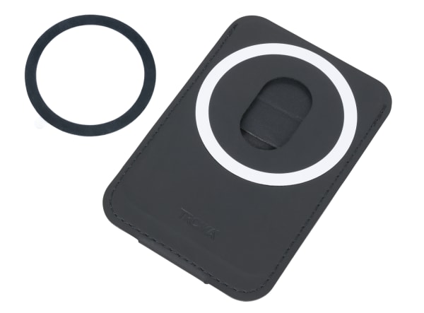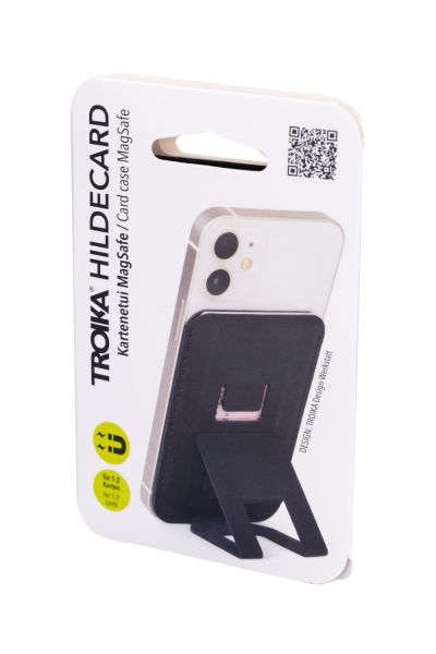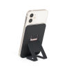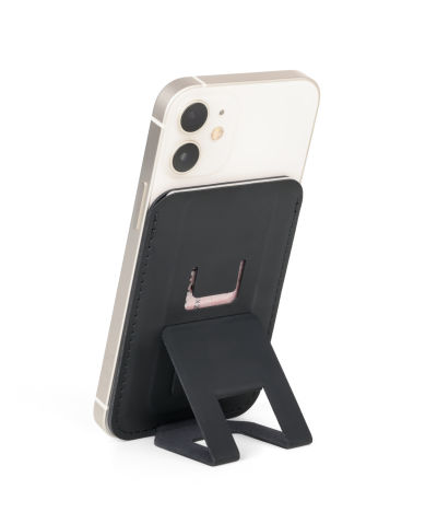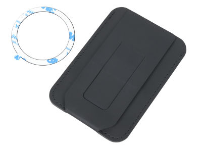 Kartenetui MagSafe, für 1-2 Karten zur magnetischen Befestigung am Smartphone, Aufstellfunktionen für horizontales und vertikales Aufrichten des Handys, zusätzlicher MagSafe Metallring mit 3M Klebefläche zur individuellen Befestigung , z.B. an allen gängigen Smartphones, Hüllen, Notizbüchern, etc., Kunstleder, schwarz
