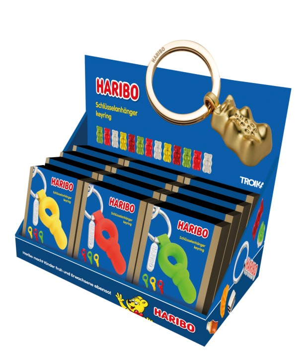 Thekendisplay inkl. 12 x HARIBO-Schlüsselanhänger, vorsortiert (je 4 x HB-K04/RD, HB-K04/YE, HB-K04/GR), zur Selbstbedienung, Pappe, bedruckt, matt, mehrfarbig