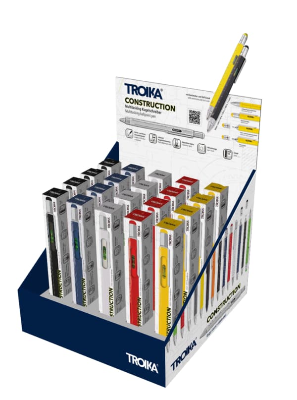 Thekendisplay inkl. 20 x CONSTRUCTION Multitasking-Kugelschreiber (PIP20..), vorsortiert (je 4 x PIP20/YE, PIP20/RD, PIP20/SI, PIP20/BL, PIP20/BK), zur Selbstbedienung, Pappe, bedruckt, matt, mehrfarbig