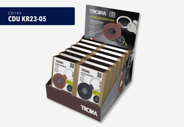 Thekendisplay inkl. 12 x TROIKA COIN ADVENTURE Schlüsselanhänger (KR23-05/..), vorsortiert (je 6 x KR23-05/BK, KR23-05/BR), zur Selbstbedienung, Pappe, bedruckt, matt, mehrfarbig