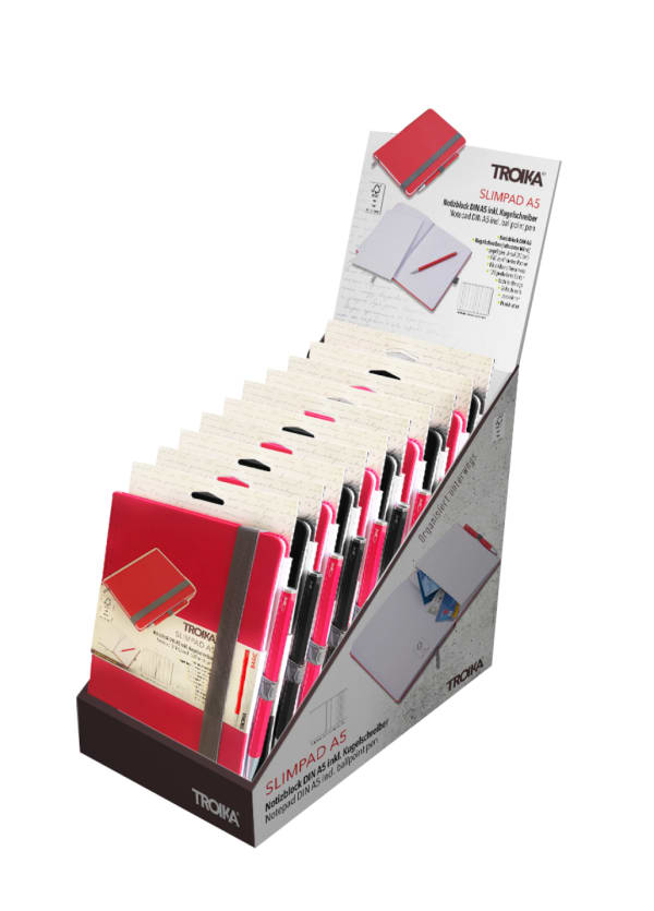 Thekendisplay inkl. 10 x SLIMPAD A5 Notizblock (NPP40/..), vorsortiert (je 5 x NPP40/BK, NPP40/RD), zur Selbstbedienung, Pappe, bedruckt, matt, mehrfarbig